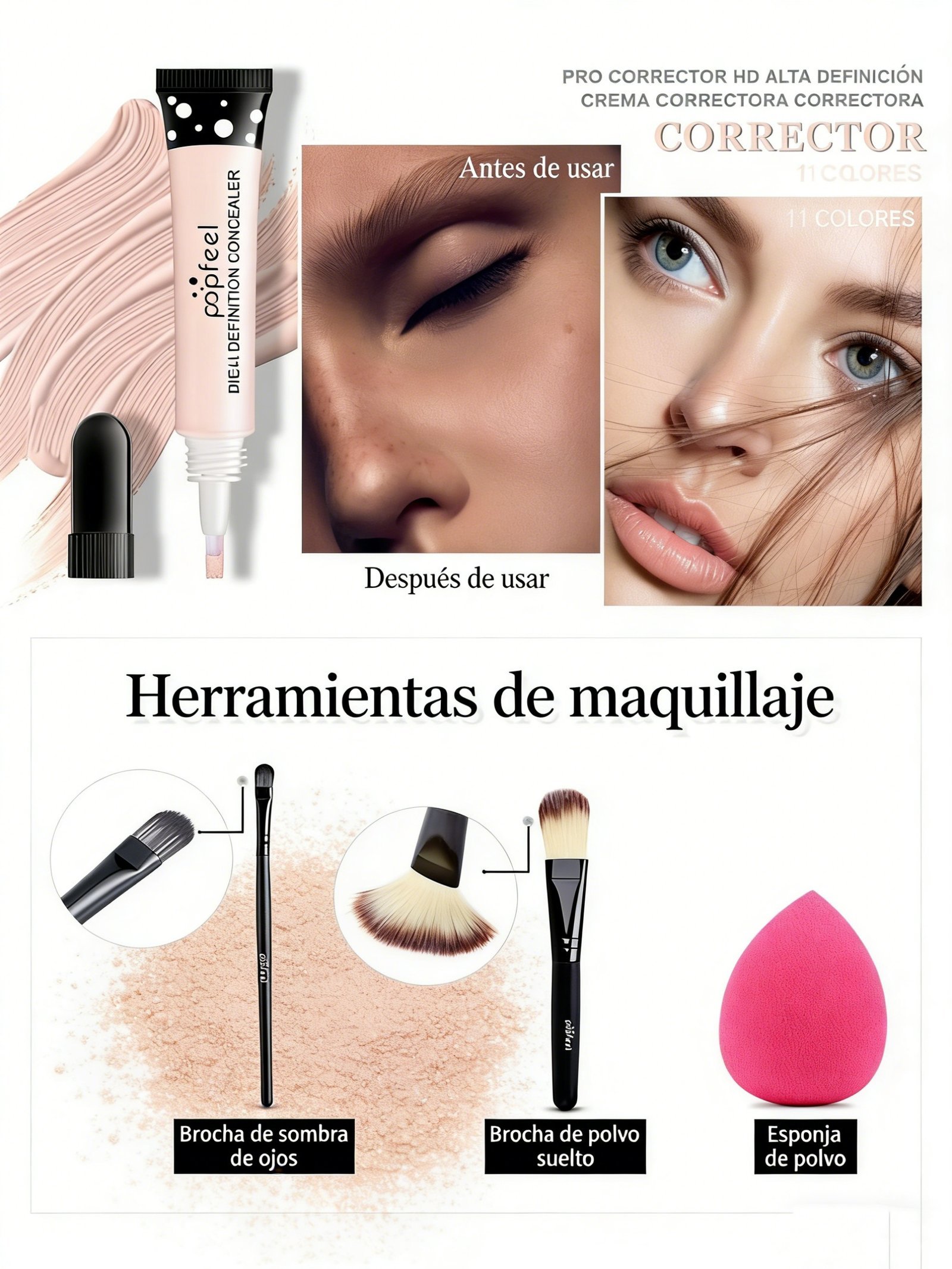 El corrector incluido cubre perfectamente las ojeras y las imperfecciones, sin tener que aplicar capas gruesas.